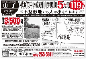 不整形地ですが100坪以上で山手駅徒歩5分の物件は希少と思い広告掲載致しました。こちらの広告も7月30日土曜に中区を中心に配布させて頂きます。建築条件等無しの売地でございますので建築家と素敵なマイホームをお建て下さい。不整形地でも120坪弱の敷地ですから楽しい家造りが出来ると思いますよ♪日当りも眺望も良好な駅まで徒歩5分の119坪。是非現地をご見学下さいませ。宜しくお願い致します。
