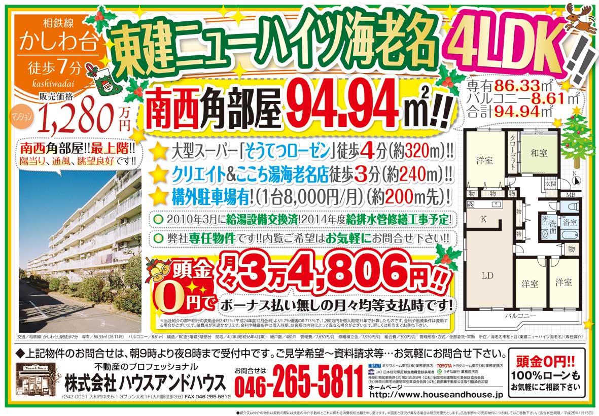 かしわ台駅周辺も大型スーパーとかドラッグストアーとか温泉施設とか某有名コーヒー店など出店されてどんどん賑やかになってきましたね。そんな「かしわ台」駅より徒歩7分に所在する東建ニューハイツ4LDK。ファミリー向けマンションです。お値段は1280万円で12月15日からの販売です。